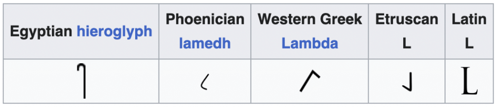 When the Greeks adopted the Phoenician script, they transformed Lamed (𐤋) into Lambda (Λ) — a shape resembling an inverted “V” or a triangle without a base. When the Romans adopted the Greek alphabet, Λ was straightened and simplified into the “L” we know today.