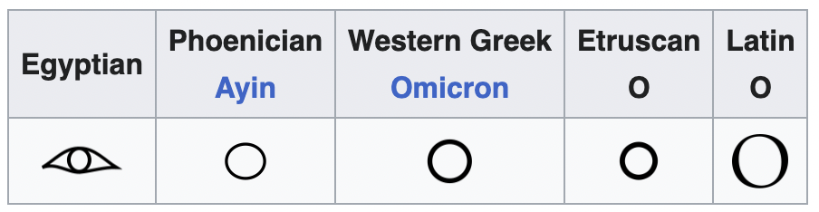 The letter O comes from the Phoenician letter “Ayin” (𐤏), meaning “eye.” The “eye” was considered the window of the soul, or the inner eye that can see beyond the material world and perceive deeper truths about reality.