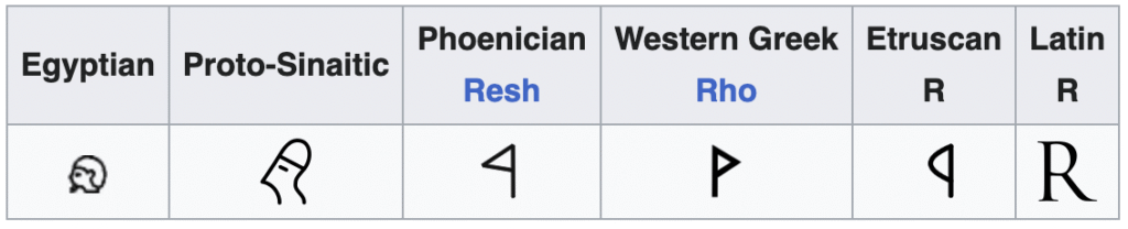 The letter R is believed to have descended from the Phoenician letter “Resh” (𐤓), which means “head”. When the Greeks adopted “Resh,” they shaped it into Rho (Ρ), which looked almost identical to our “P”.